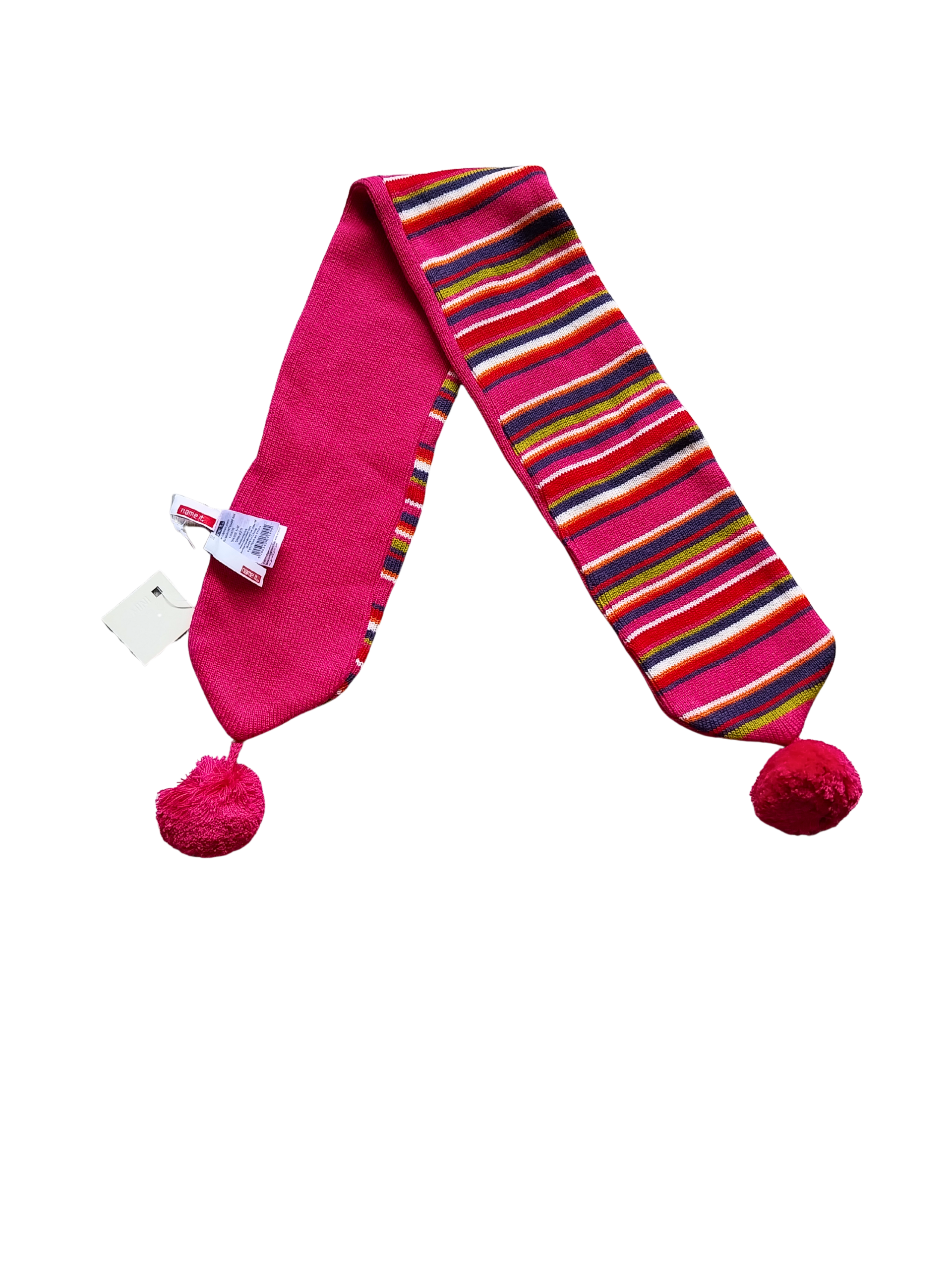 De sjaal is aan 1 kant kleurrijk en aan de andere kant fuchsia roze met aan beide uiteinden een pompom.