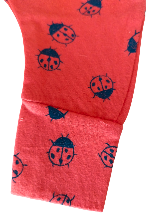 Prachtig broekje van Imps&Elfs in donkerrose met lieveheersbeestjes. De boordjes aan de onderkant van de pijpjes kunnen omgeslagen worden, in de taille elastiek met een koord.