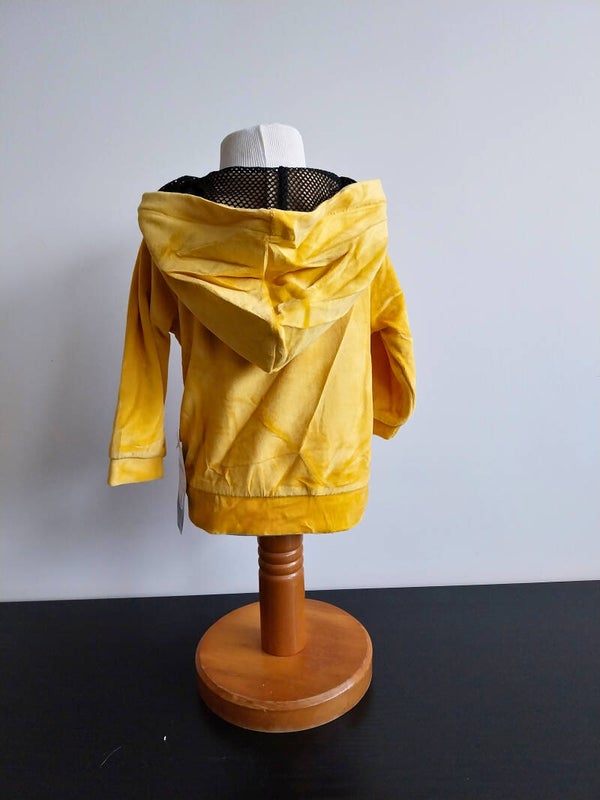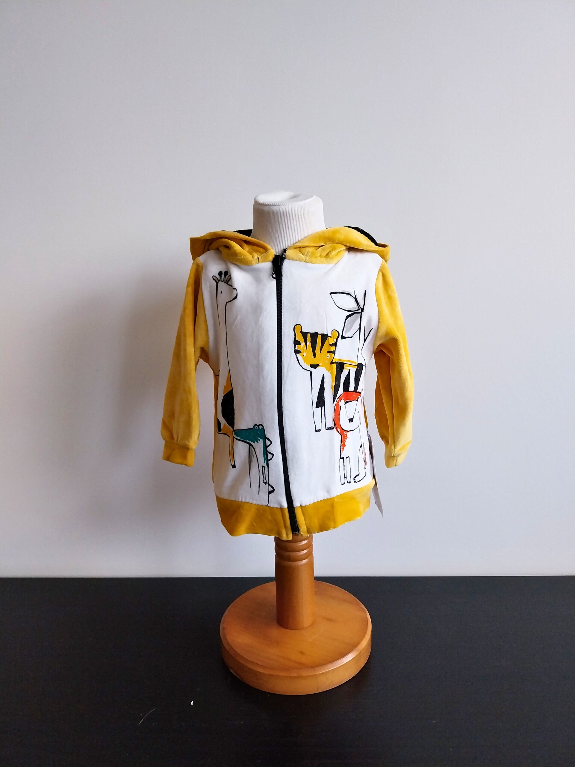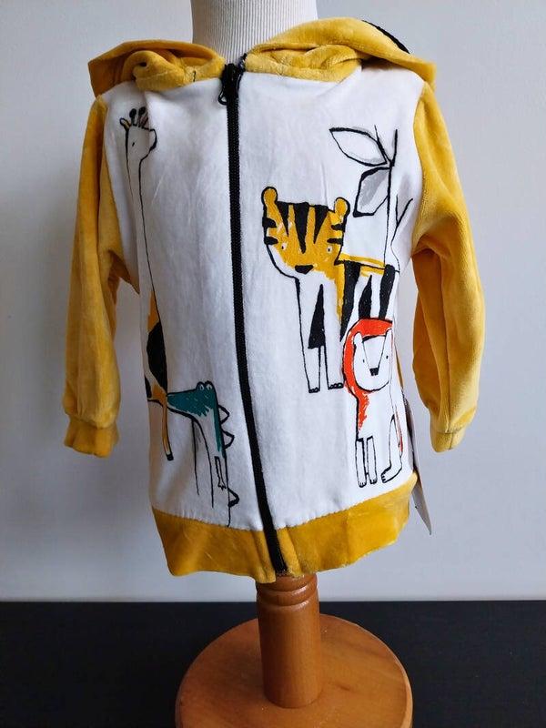 Heel fijn en zacht vestje van een soort veloursachtige stof, heel comfortabel om te dragen, fijn om even aan te doen bij wat frissere voorjaarsdagen. Het jasje is in een mooie kleur okergeel en aan de voorkant wit met een opdruk van verschillende wilde dieren (giraffe, krokodil, tijger, beer). Te openen en sluiten met een rits. Nieuw met kaartje.