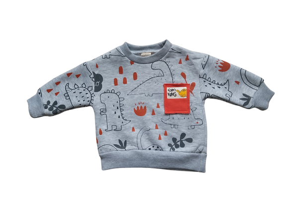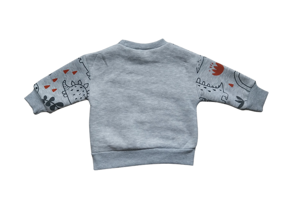 Prachtig 2 delig pakje, bestaande uit een sweater en broekje met dino printje op de voorkant en op de mouwen.