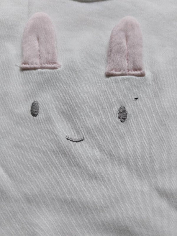 Rompertje van fijne zachte 100% organische katoen met 2 drukkertjes op de schouder en 2 drukkertjes in het kruisje in creme kleur met een konijnensnoetje op de borst met 2 grappige roze konijnenoortjes.