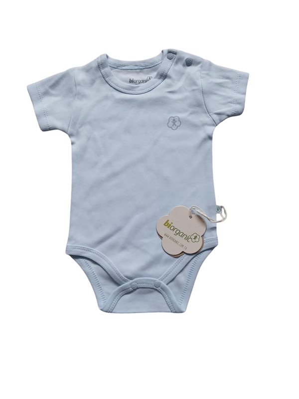 Lichtblauw rompertje met korte mouwen van fijne zachte 100% organische katoen met 2 drukkertjes op de schouder en 2 drukkertjes in het kruisje Nieuw met kaartje.