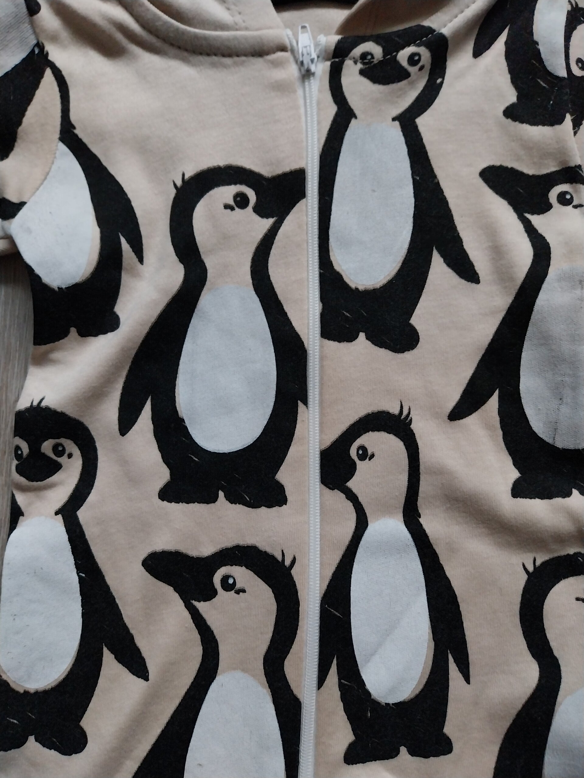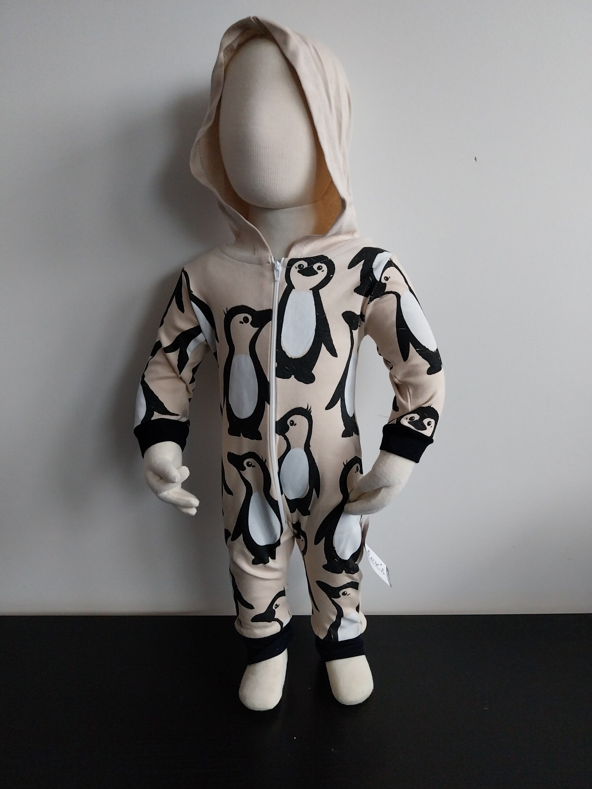 Leuk boxpakje met muts in beige met een all over printje van pinguins op de voorkant en de mouwen, de achterkant is blank. Te openen en sluiten met een rits aan de voorkant. Nieuw met kaartje. Kan voor jongens en meisjes. 100% Katoen