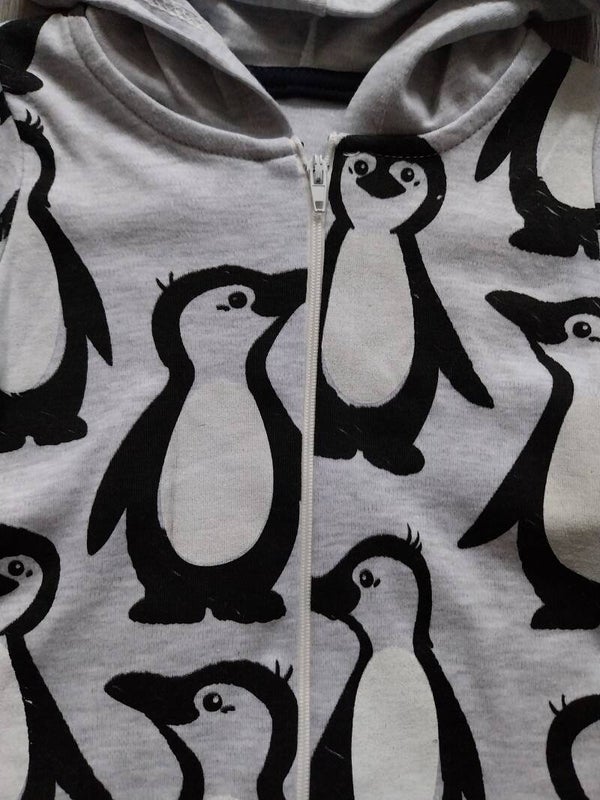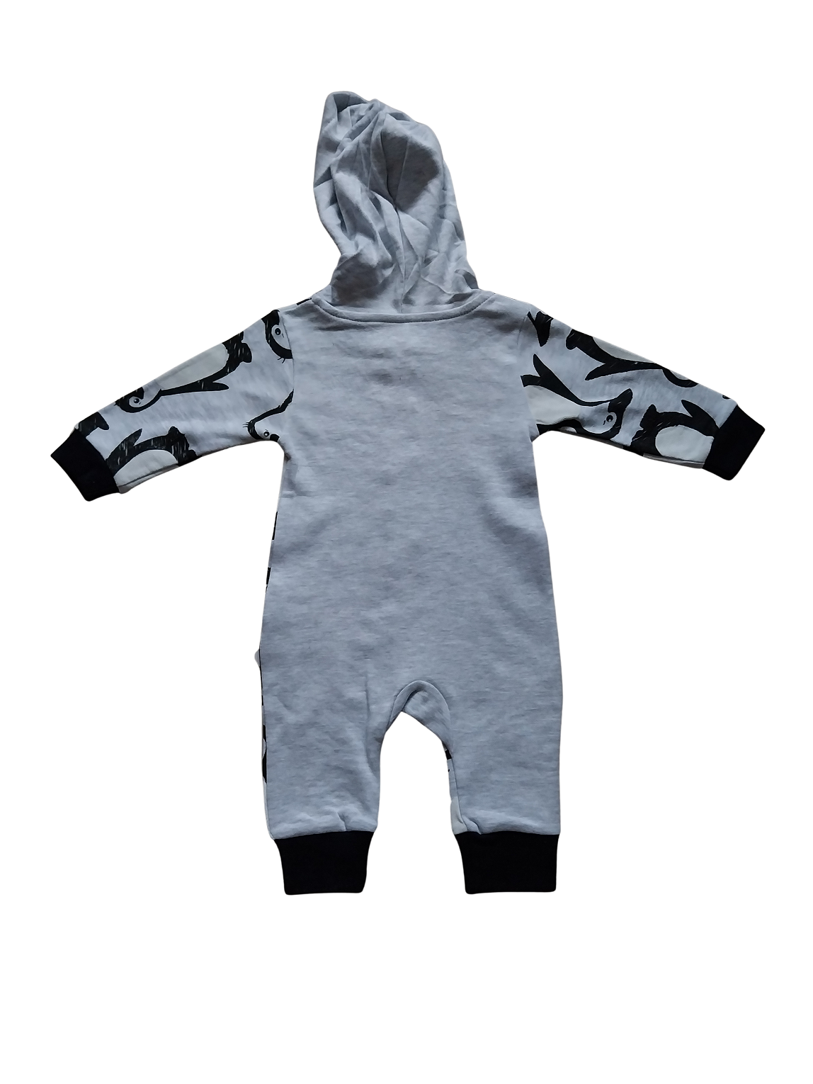 Leuk boxpakje met muts in grijs met een all over printje van pinguins op de voorkant en de mouwen, de achterkant is blank.