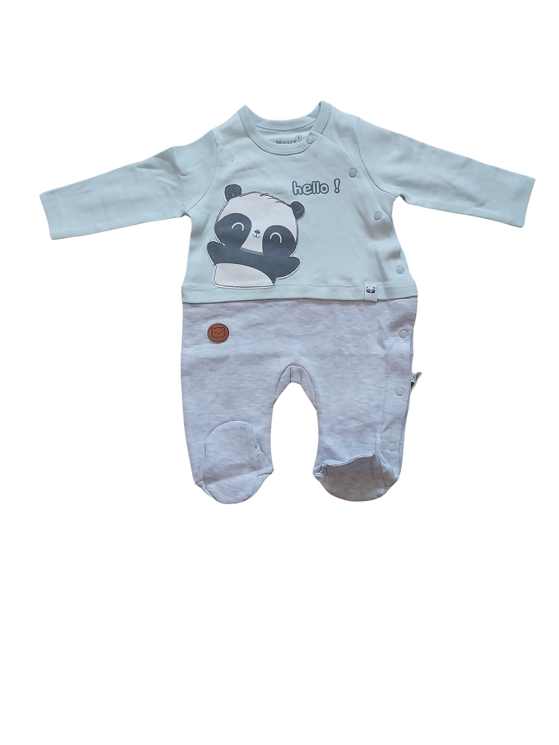 Fijn boxpakje van zachte organic katoen in licht turquoise met grijs met een printje van een panda beer en de tekst Hello.