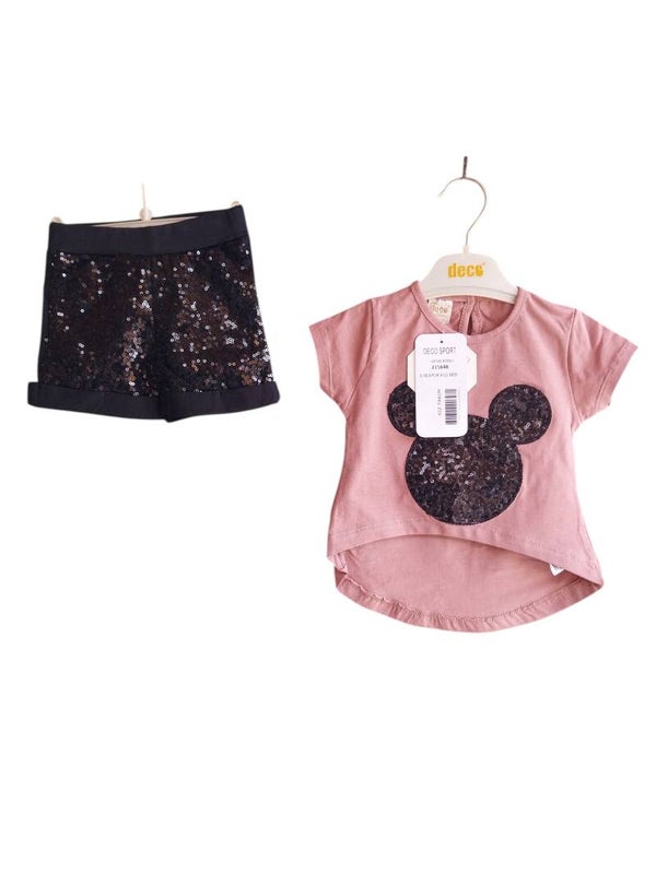 Prachtige tweedelige kledingset met korte mouwen en een korte broek, superleuk voor een zomers feestje, bestaande uit een oud roze T-shirt en een zwarte korte broek.