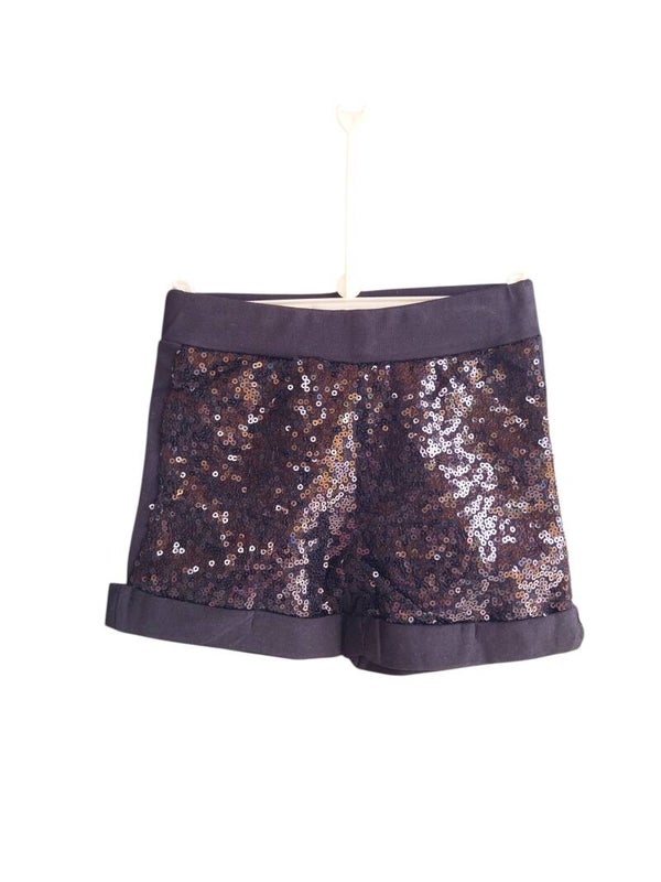 De bijbehorende zwarte shorts zijn aan de voorkant volledig bedekt met pailletten, wat voor een feestelijke uitstraling zorgt.