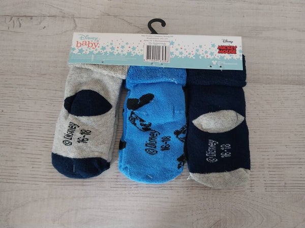 Set van drie paar vrolijke babysokjes van Disney Baby. De van bekende Disney-figuren. Inhoud van de set: Donkerblauw: Met een afbeelding van Pluto. Helderblauw: Met een all-over print van Mickey Mouse gezichtjes. Grijs: Met een afbeelding van Donald Duck. Leuk als cadeautje of voor je eigen kleintje! Nieuw met verpakking Materiaal: Zacht en rekbaar katoenmix. Geschikt voor leeftijd 0-6 maanden ongeveer. 70% Katoen 28% Polyester 2% Elastaan