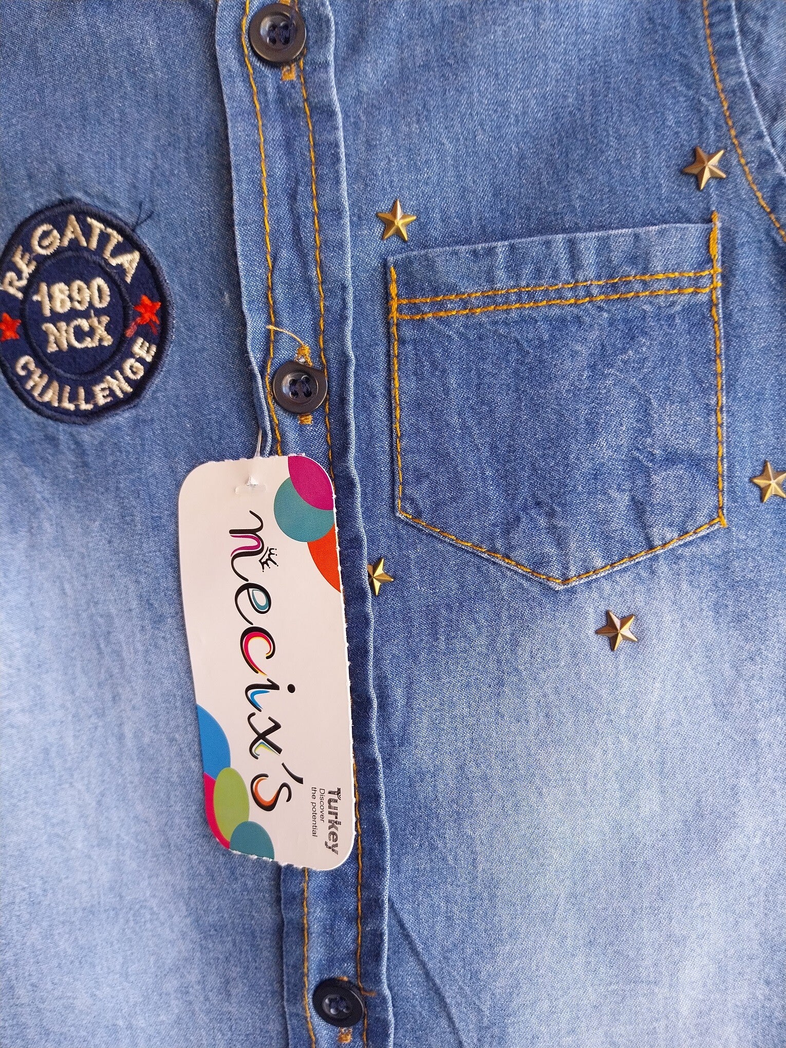 Overhemd: Een prachtig blauw denim-look shirt met korte mouwen. Het overhemd heeft een stoere Regatta Challenge patch op de borst en subtiele, goudkleurige sterretjes bij de borstzak. De knoopsluiting geeft het een nette uitstraling.