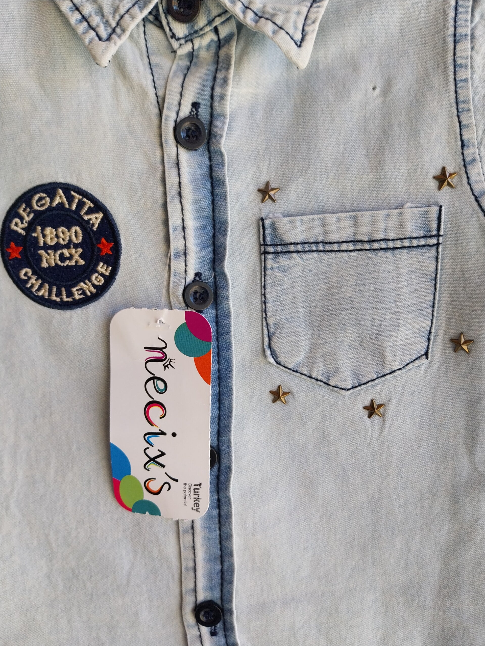 Overhemd: Een prachtig licht blauw denim-look shirt met korte mouwen. Het overhemd heeft een stoere Regatta Challenge patch op de borst en subtiele, goudkleurige sterretjes bij de borstzak. De knoopsluiting geeft het een nette uitstraling.