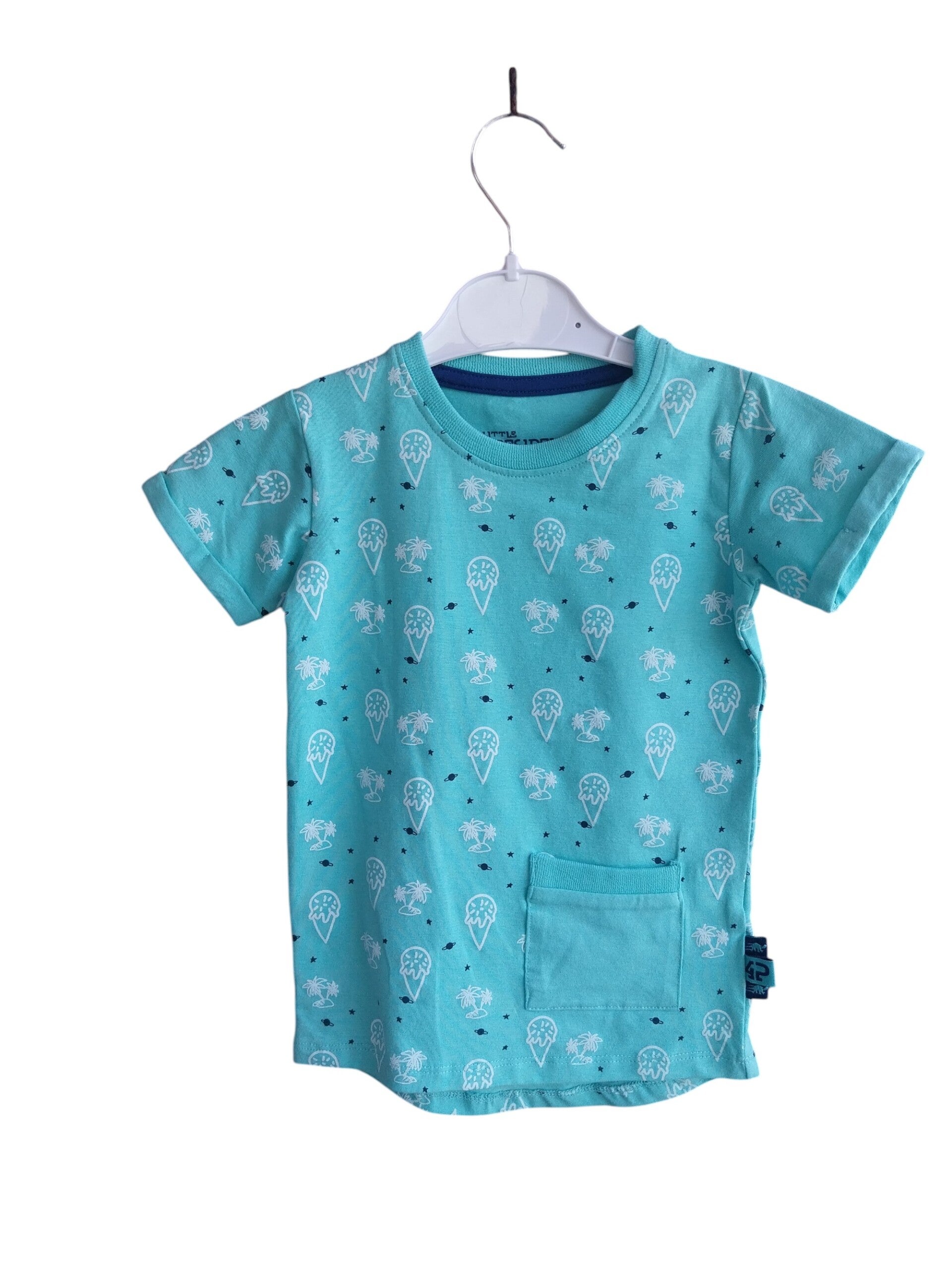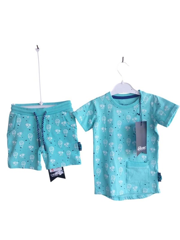 De set is uitgevoerd in een frisse aqua-blauwe kleur met een unieke all-over ijsjesprint.