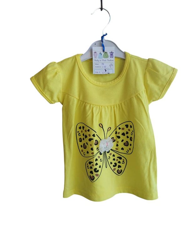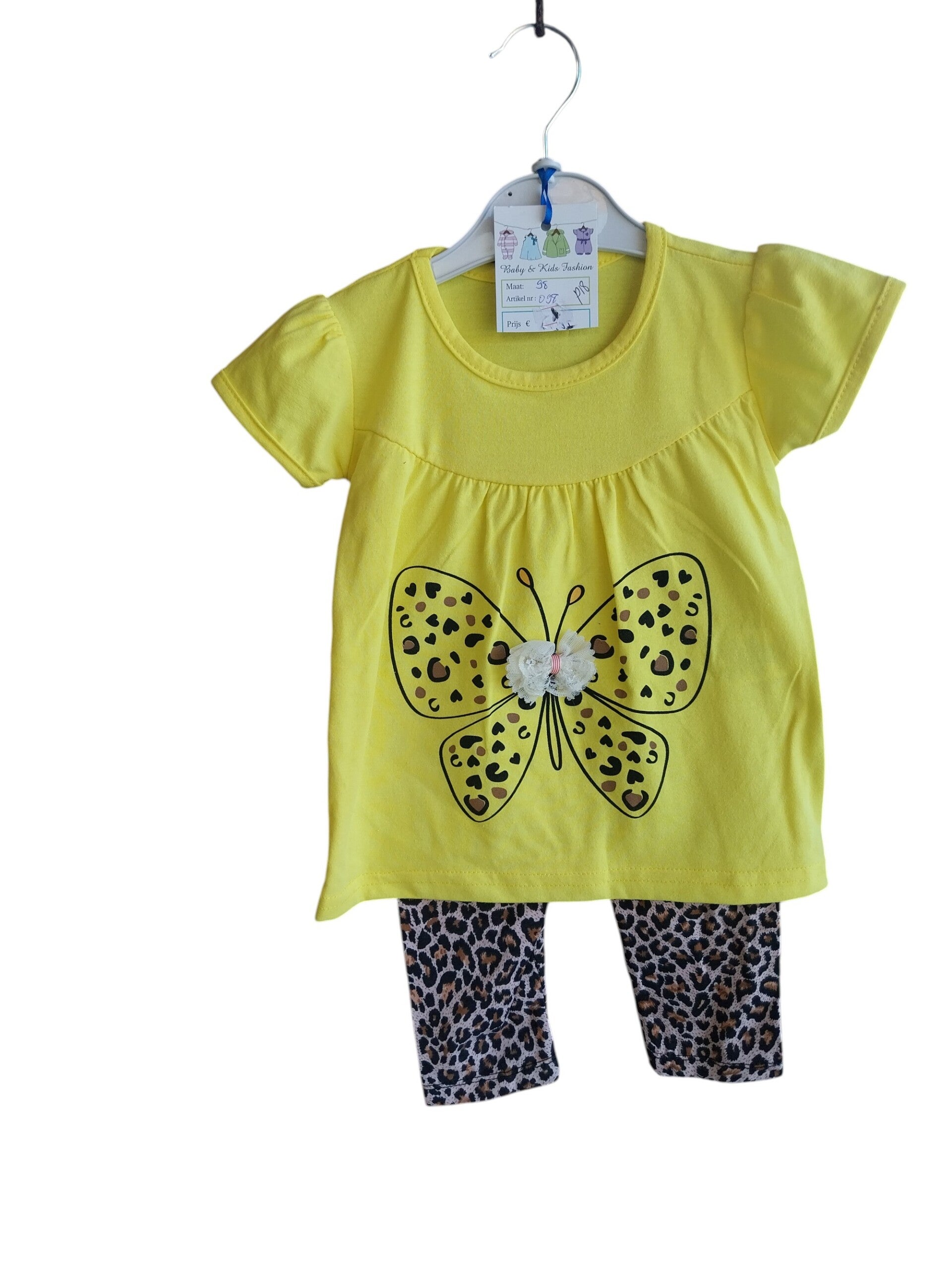 Geel T-shirt: Een zonnig geel shirt met korte pofmouwtjes. Op de voorkant staat een grote afbeelding van een vlinder. De vlinder is ingevuld met een panterprint, wat een speelse link legt naar de legging.