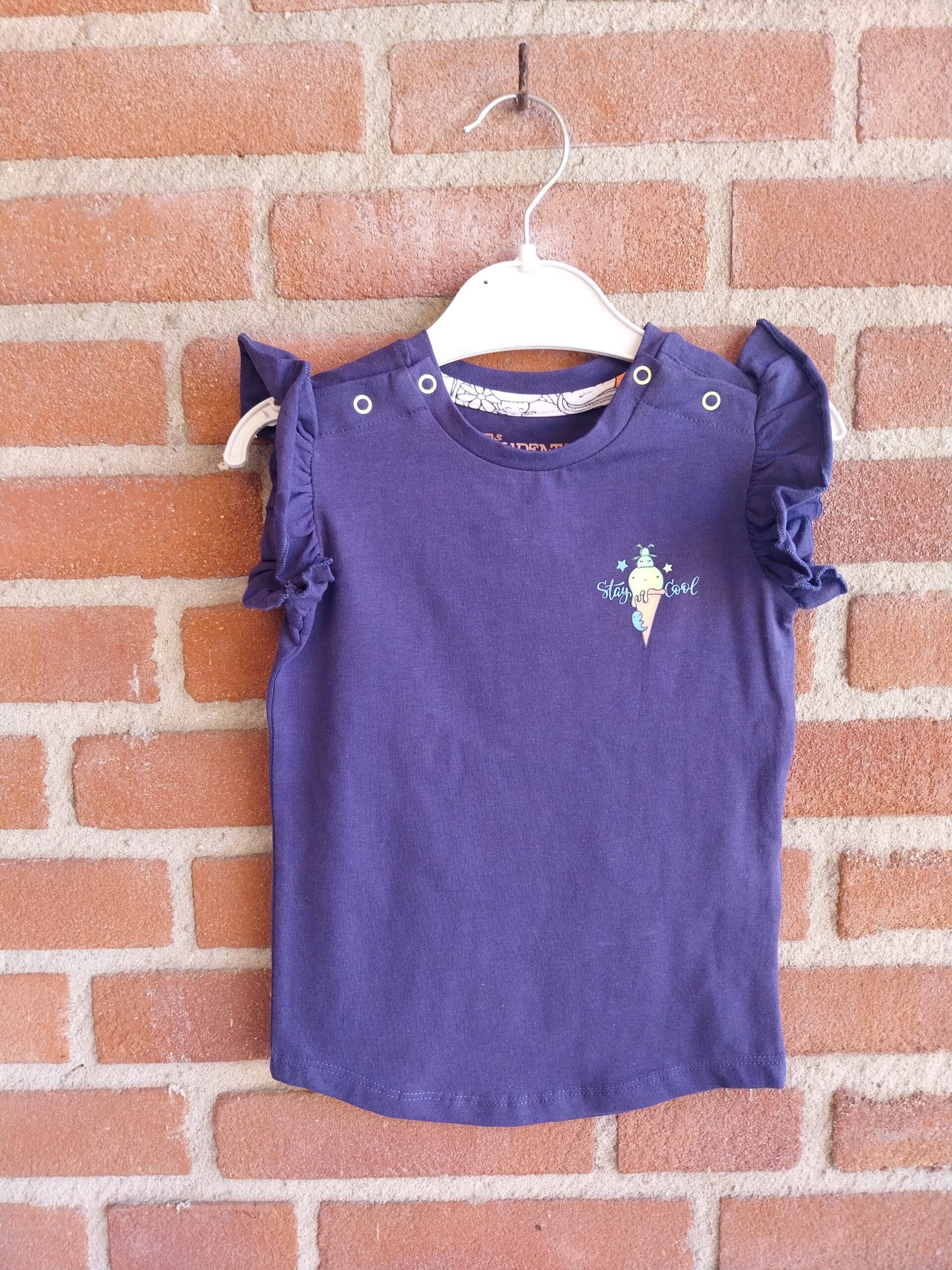 Dit donkerblauwe T-shirt van het merk 4President (model Orly) is een stijlvol en speels item voor meisjes. Het shirt valt op door de gedetailleerde afwerking en de zomerse print.