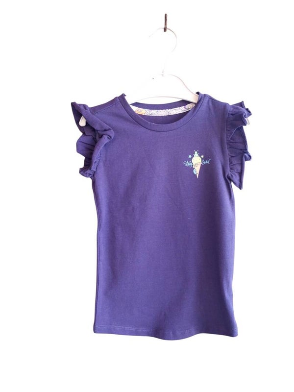 Het shirt heeft opvallende ruches (volants) bij de schouders voor een extra meisjesachtige look.