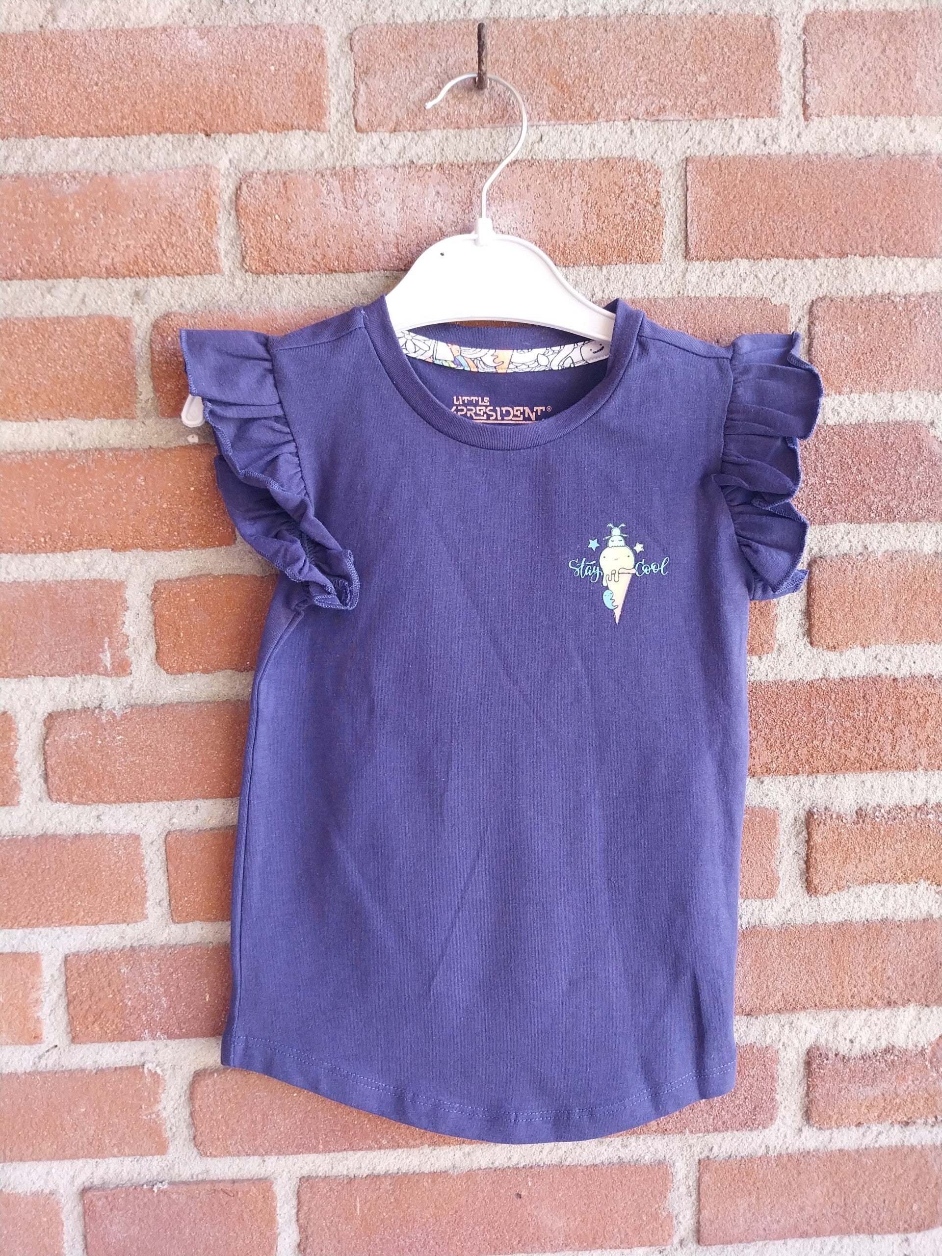 T-shirt: Marineblauw met trendy volants/ruches op de mouwen en een print van een ijsje met de tekst Stay Cool op de borst.