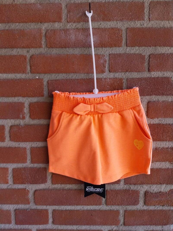 Rokje: Comfortabele stof in de kleur neon bright coral, voorzien van 2 steekzakken, een sierlijk strikje en een subtiel hartje op de pijp.
